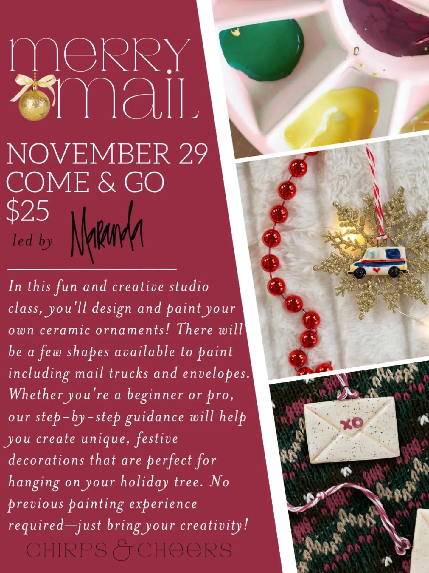 In this fun and creative studio class, you'll design and paint your own ceramic ornaments! There will be a few shapes available to paint including mail trucks and envelopes. Whether...