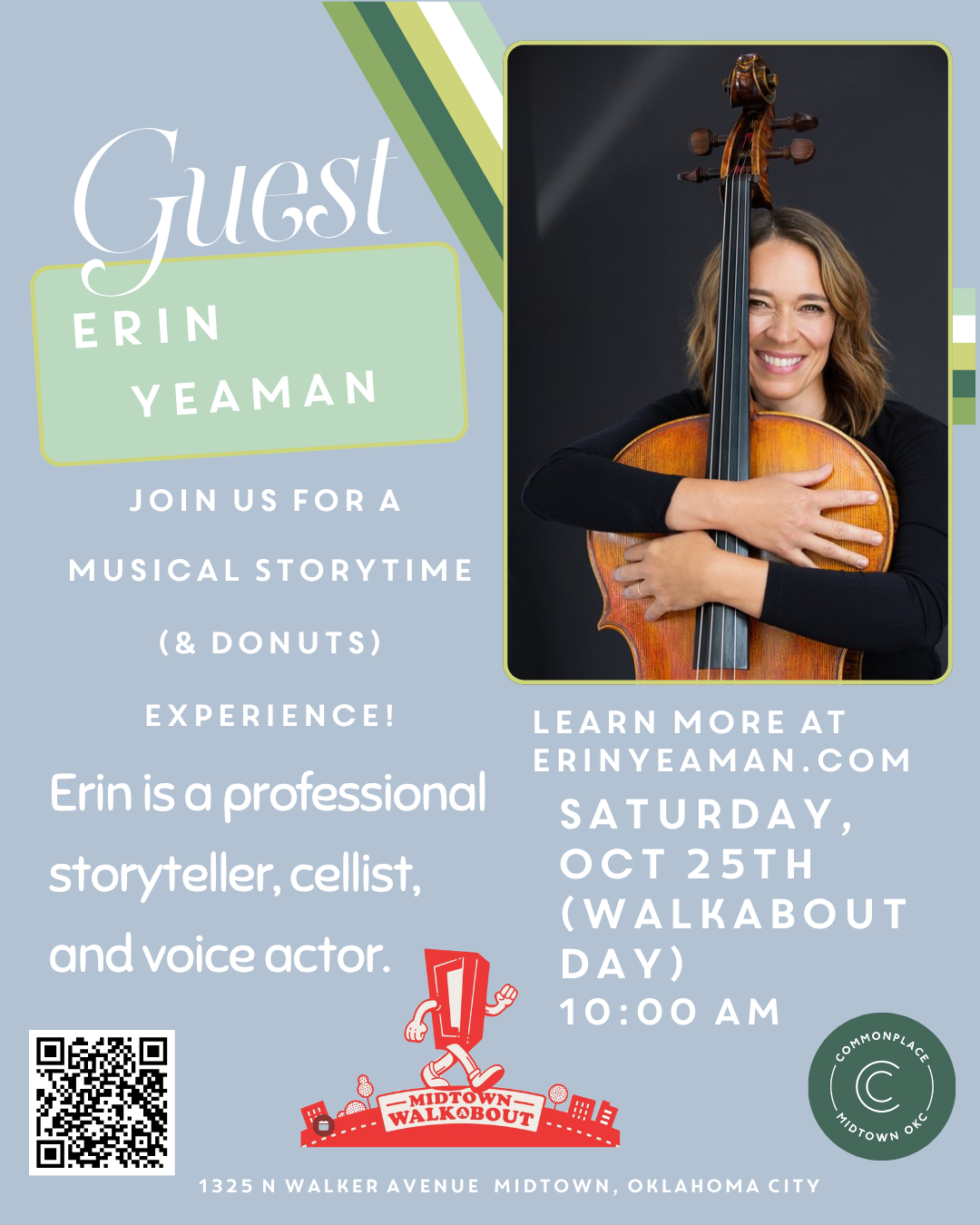 Join us for an extra-special, Midtown-Walkabout storytime with Erin Yeaman. Erin is a professional storyteller, cellist, and voice actor. We had a tremendous response to her last visit, so we knew we wanted her back for Walkabout.